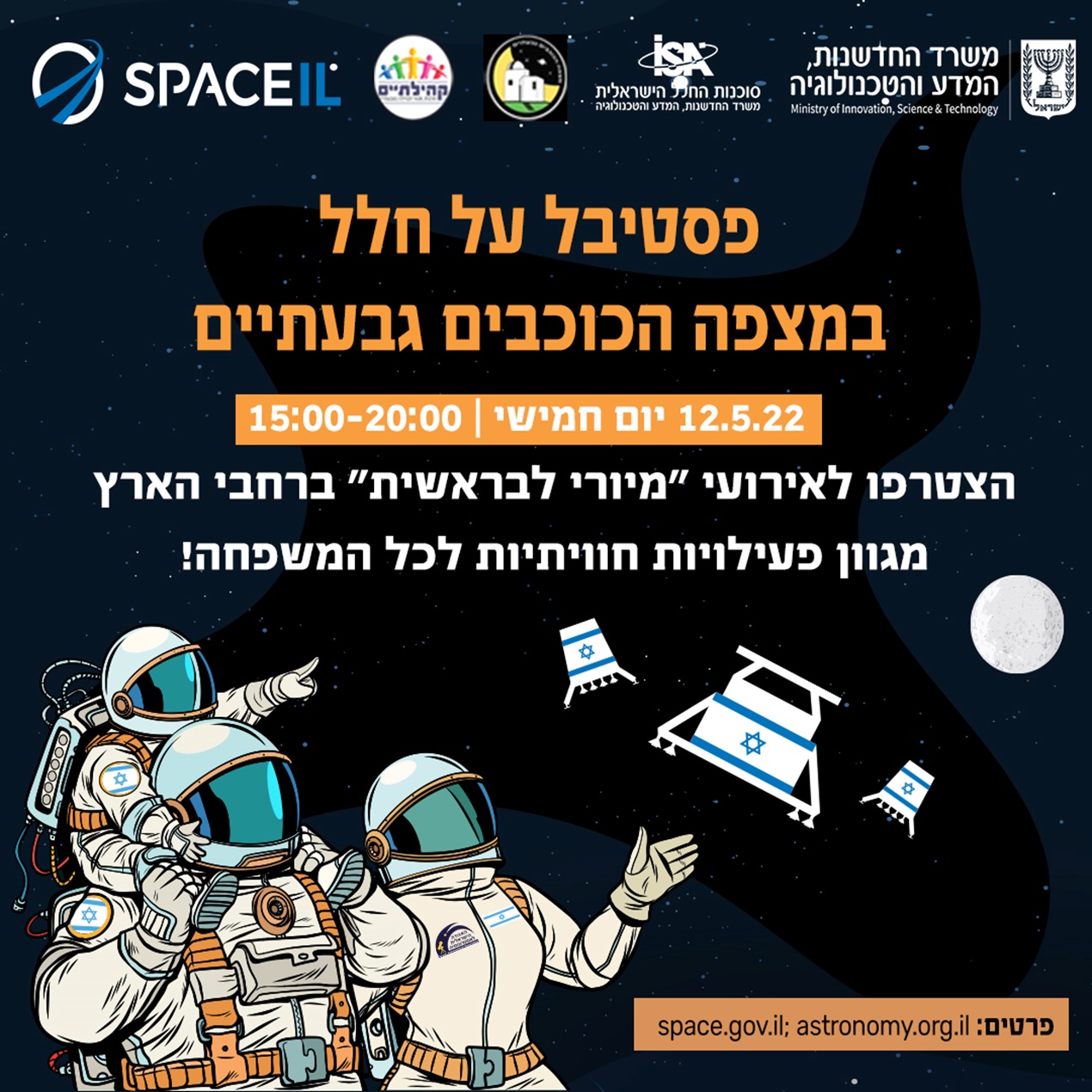 אירועי "מיורי לבראשית" גבעתיים - פעילויות חלל מרתקות לכל המשפחה במצפה הכוכבים גבעתיים בשיתוף עם האגודה הישראלית לאסטרונומיה וסוכנות החלל הישראלית במשרד החדשנות, המדע והטכנולוגיה.